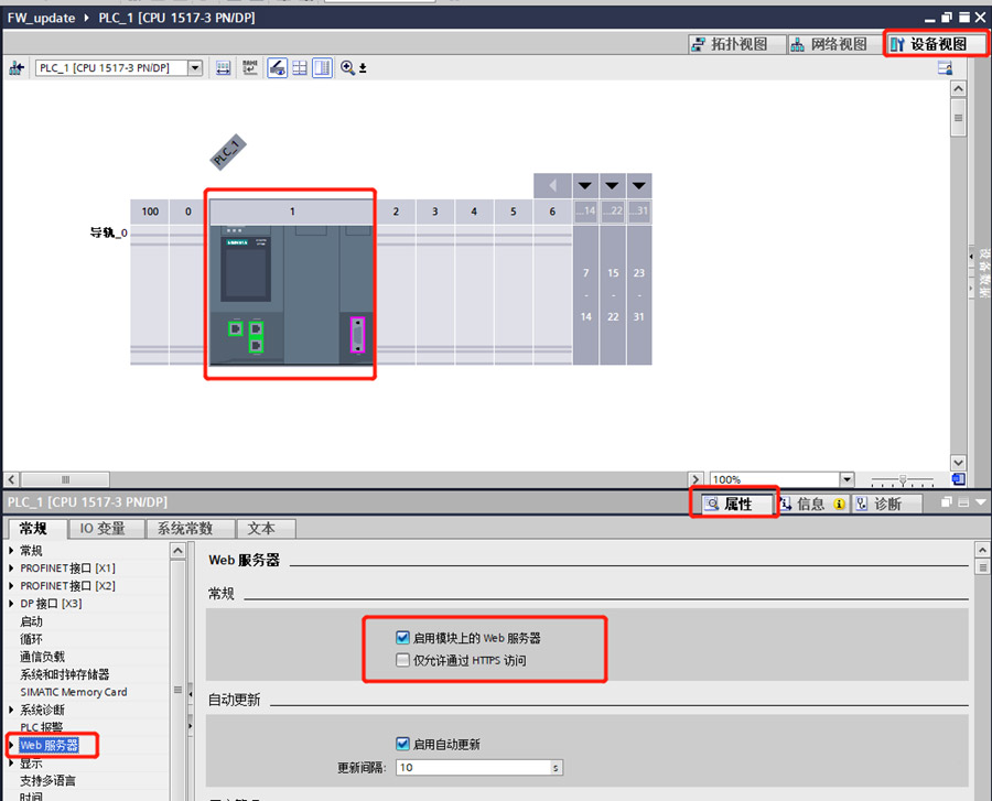 在使用Web服務(wù)器訪問之前,需要先啟用CPU的Web服務(wù)器訪問功能。具體步驟如下:1. 在設(shè)備視圖中,啟用CPU的Web服務(wù)器功能2. 勾選“執(zhí)行固件更新”訪問權(quán)限