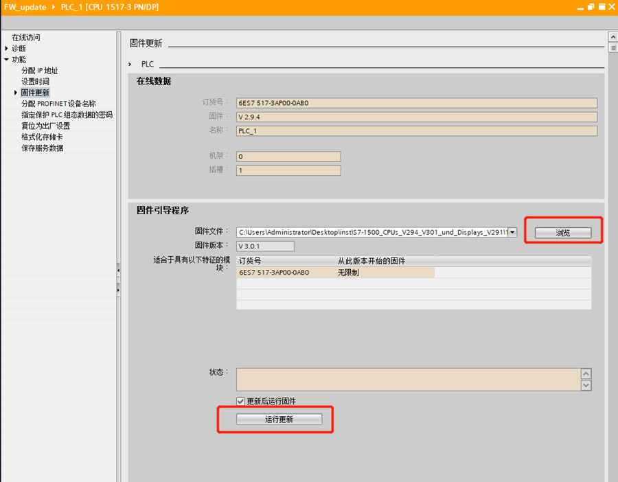 借助TIA Portal軟件,對(duì)已組態(tài)的CPU進(jìn)行固件更新的步驟如下:1. 先將CPU轉(zhuǎn)至在線,在線和診斷中點(diǎn)擊“功能”-“固件更新”,在PLC下選擇固件文件,運(yùn)行更新顯示下選擇對(duì)應(yīng)文件并運(yùn)行,即是對(duì)CPU顯示屏更新固件: